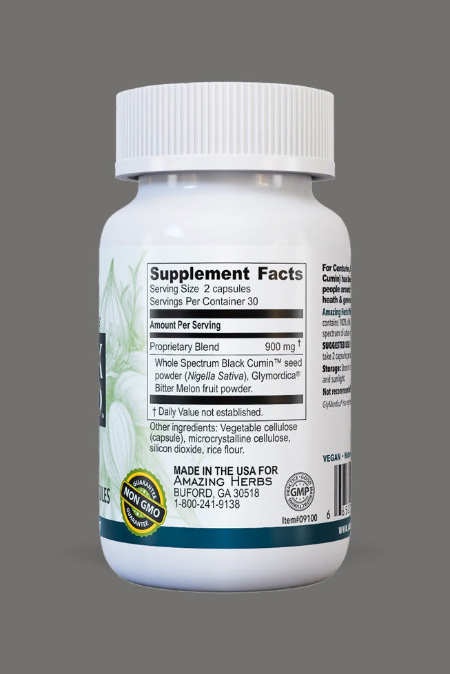 Whole Spectrum™ Black Cumin Seed powder (Nigella Sativa), Bitter Melon fruit powder Other Ingredients: Vegetable cellulose (capsule), microcrystalline cellulose, silicon dioxide, rice powder